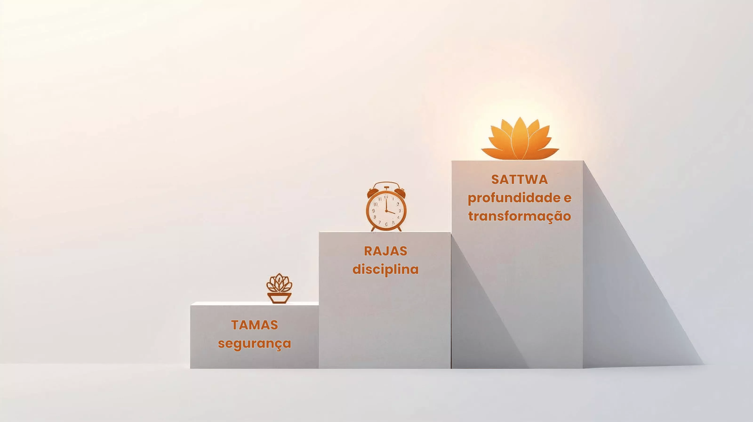 O Yôga não é para quem é flexível, é para quem quer ser. O Método Sattwa é progressivo: você começa na Fase 1 (tamas) aprendendo a base e só avança quando seu corpo se sentir pronto e seguro.